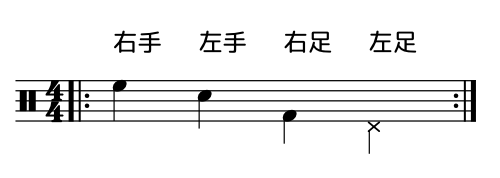 手足のタイミングが重ならない奏法。4本の手足がひとつずつ順番に動くため、各音がクリアに聴こえます。ファンク・ヒップホップ・R&Bで多用され、コーディネーション能力の飛躍的な向上をもたらします。