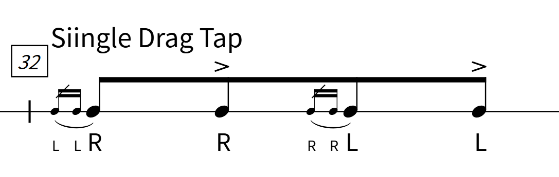 ドラッグとは、主音の直前に同じ手で2音の装飾音を打つ奏法です。フラムが「異なる手で1音の装飾」であるのに対し、ドラッグは「同じ手で2音の装飾」が特徴です。小文字2つが装飾音(弱)、大文字が主音(強)を表します(例:llR = 左手2音装飾+右主音)。