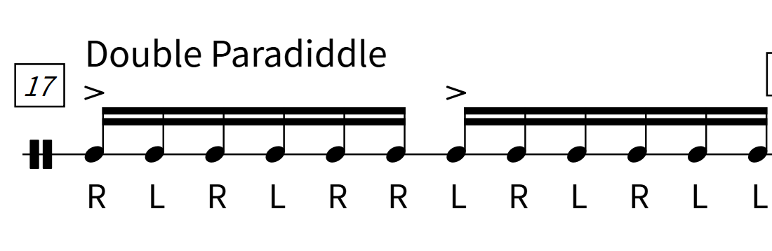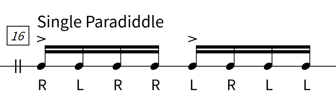 最も基本的なパラディドル。「シングル2打+ダブル」の構成(R L R R / L R L L)で、8打でひとつのまとまりを作ります。