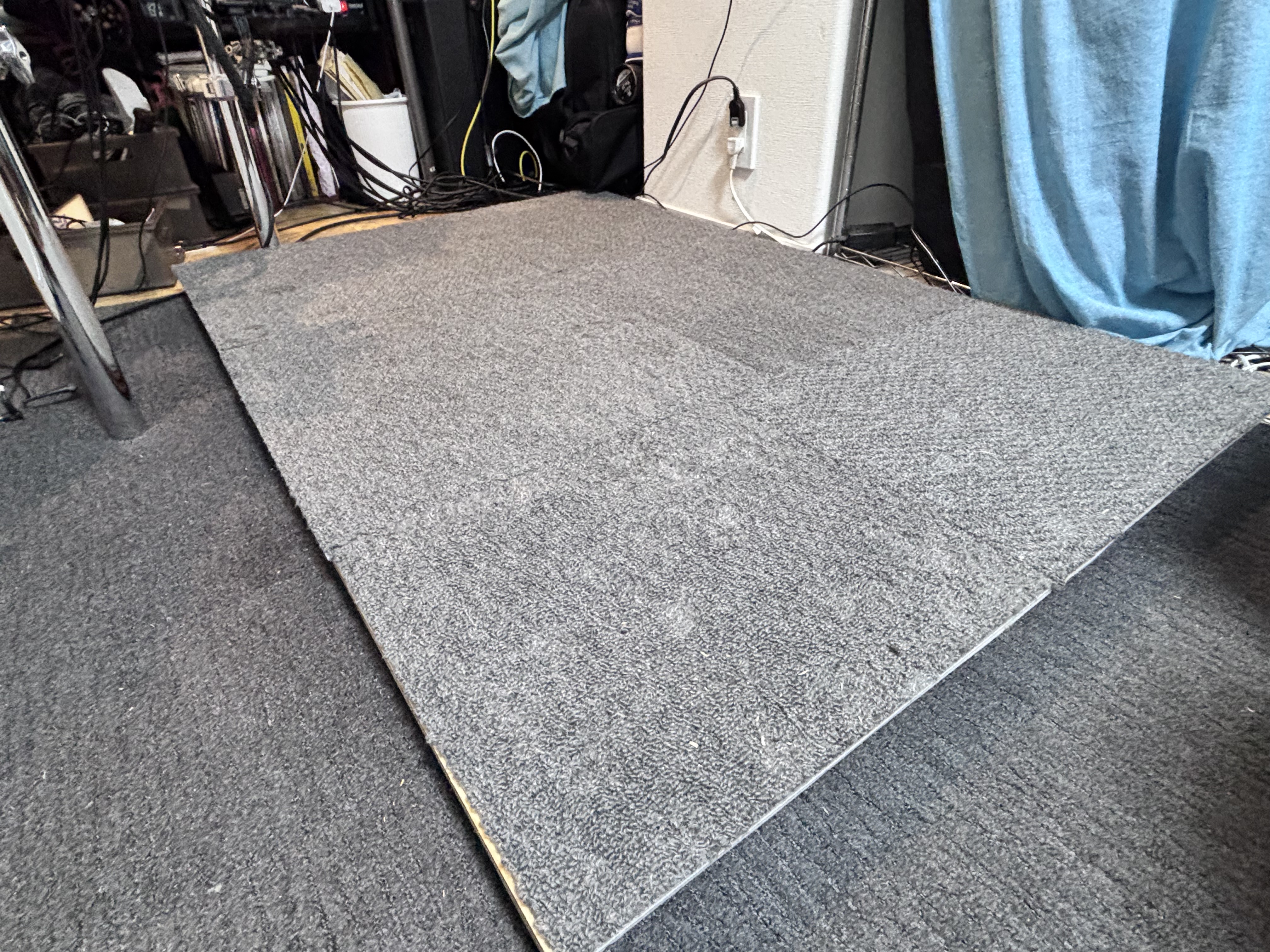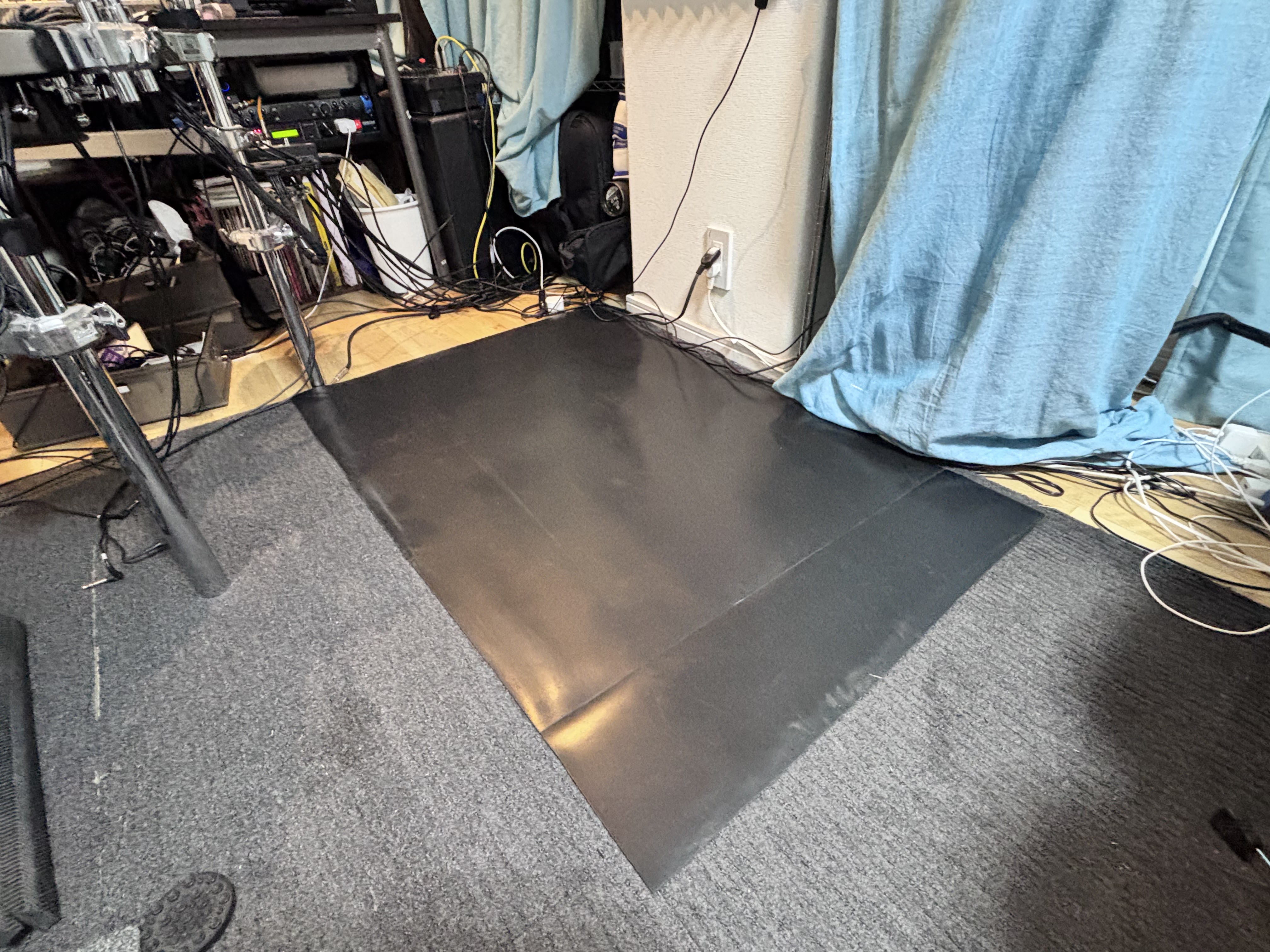 最下層に敷くゴムシートです。床との密着を均一にすることで、コンパネが安定して防振層全体が正しく機能するようになります。薄くても密度が高く重さがあるため、ジョイントマットより防振への寄与が高いです。