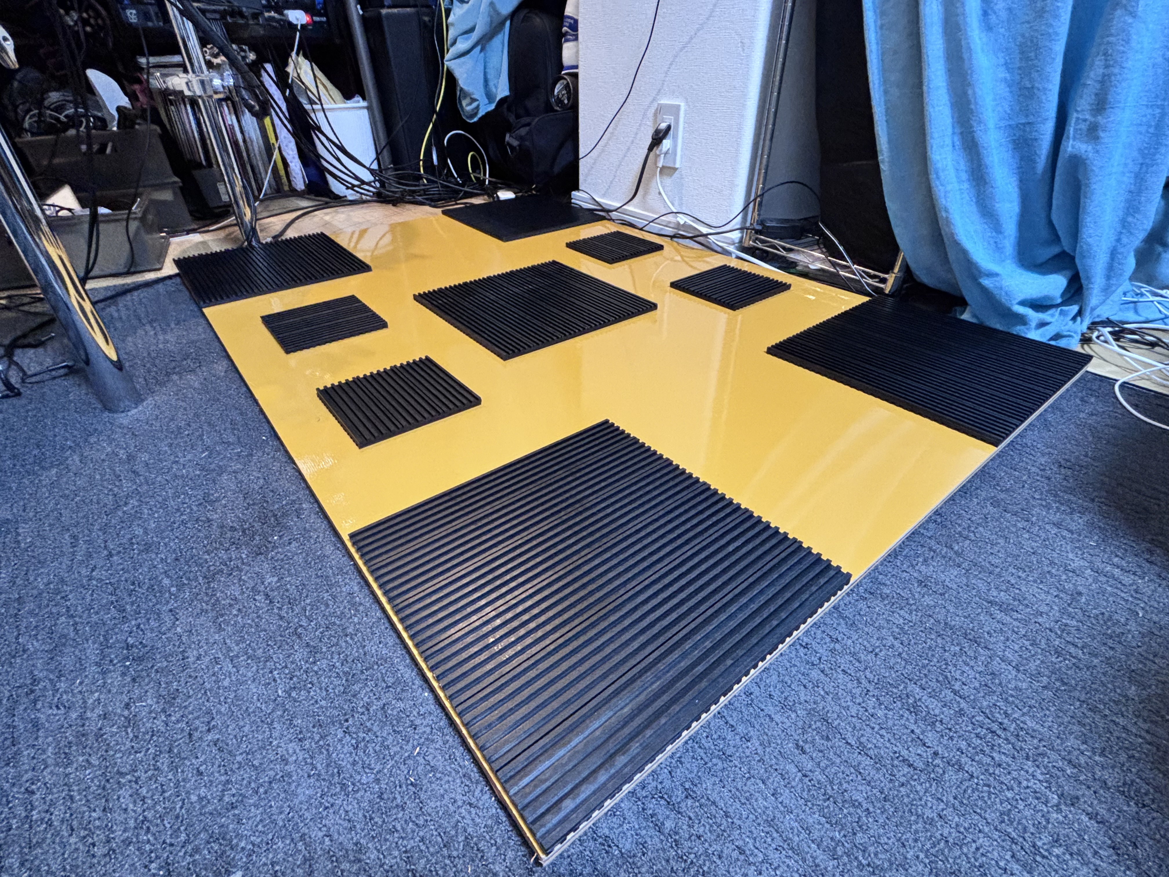 両面凹凸タイプ(厚さ約1cm)を30×30cmサイズで5枚使用します。コンパネとコンパネの間に配置することで振動の伝達経路を分断します。向きはランダムに置くことで特定方向への共振を防げます。キックペダルの直下に1枚必ず来るよう配置するのがポイントです。